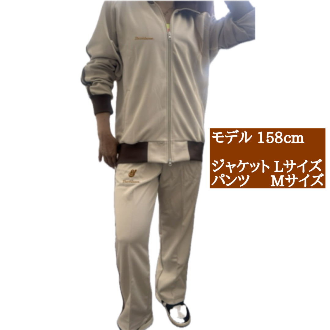 サンドベージュのボディにダークブラウンのサイドラインになり、胸元のロゴは刺繍になります。
