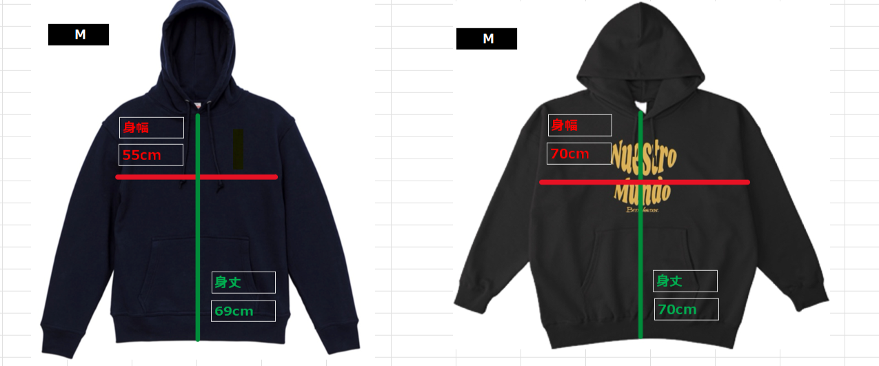 当ストアのビックシルエットシリーズとはサイズが異なりますので、以下のサイズ表を確認し、ご購入頂きますようお願いいたします。